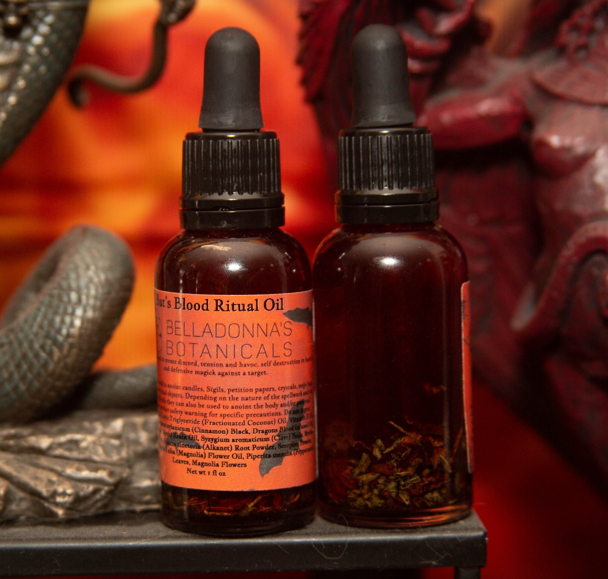 Bats Blood Oil is used to create discord, tension and havoc, self destruction in baneful and defensive magick against a target.