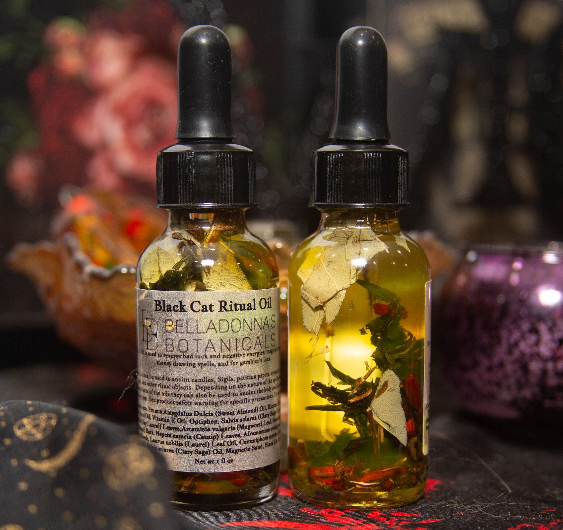 Black Cat Ritual Oil is used to reverse bad luck and negative energies, magical reversing spells, money drawing spells, and for gambler’s luck.