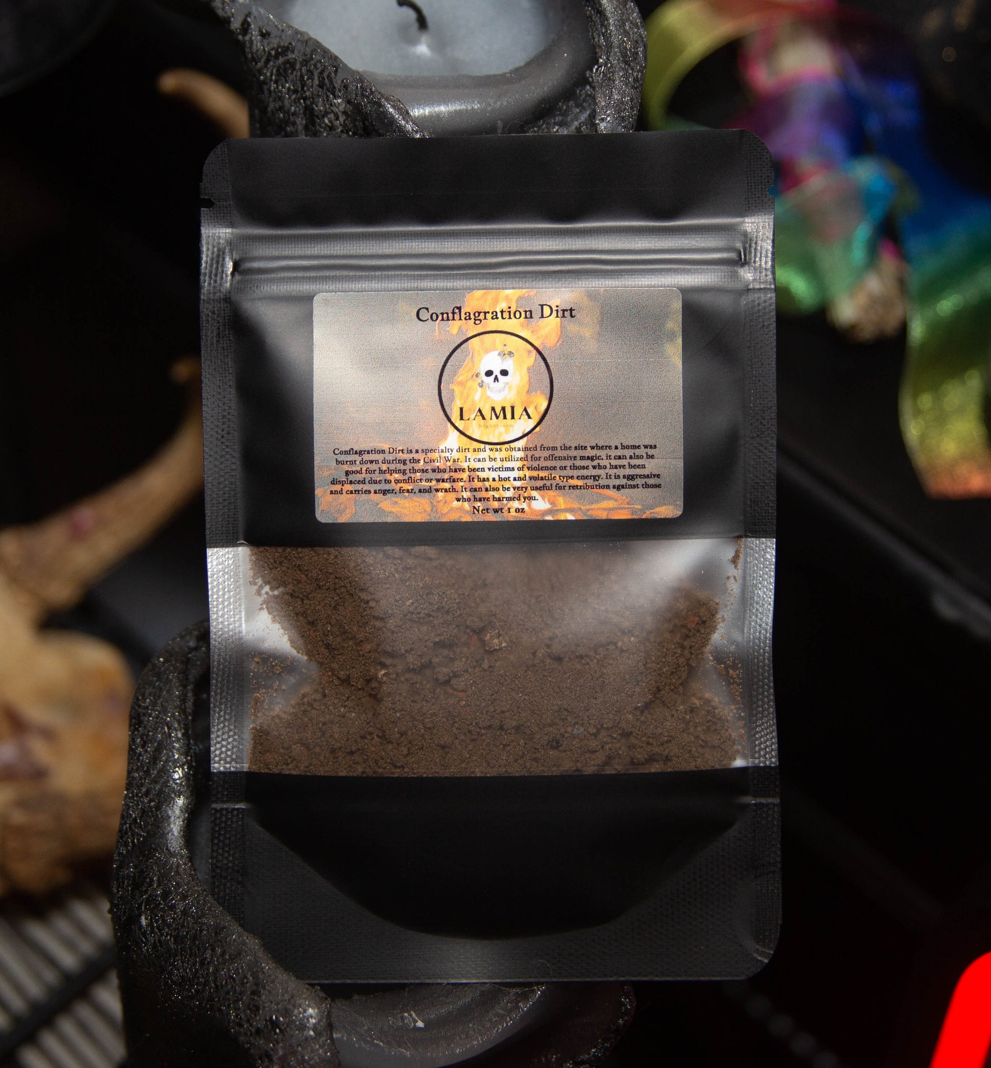 Conflagration Dirt is a specialty dirt and was obtained from the site where a home was burnt down during the Civil War. It can be utilized for offensive magic, it can also be good for helping those who have been victims of violence or those who have been displaced due to conflict or warfare. It has a hot and volatile type energy. It is aggressive and carries anger, fear, and wrath. It can also be very useful for retribution against those who have harmed you.