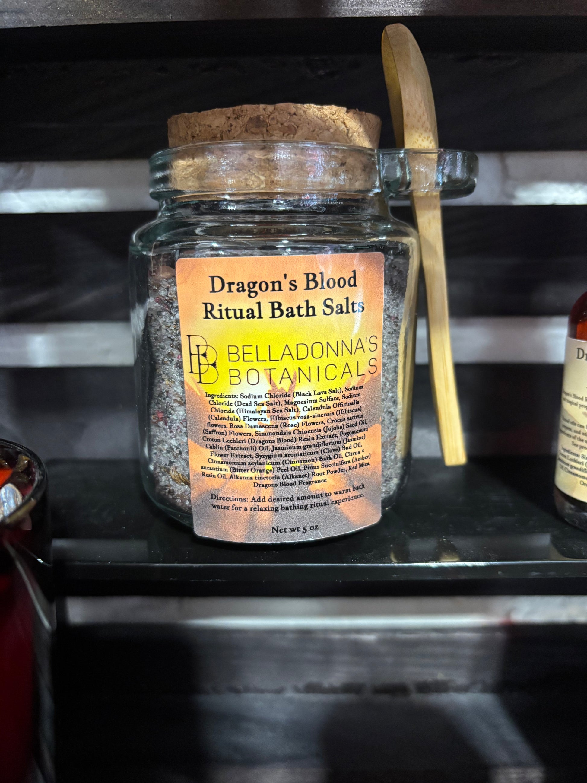Materials: Black Lava Salt,Epsom Salt,Dead Sea Salt,Himalayan Sea Salt,Saffron Flowers,Calendula Flowers,Hibiscus Flowers,Rose Petals,dragons blood oil,dragons blood fragrance,red mica