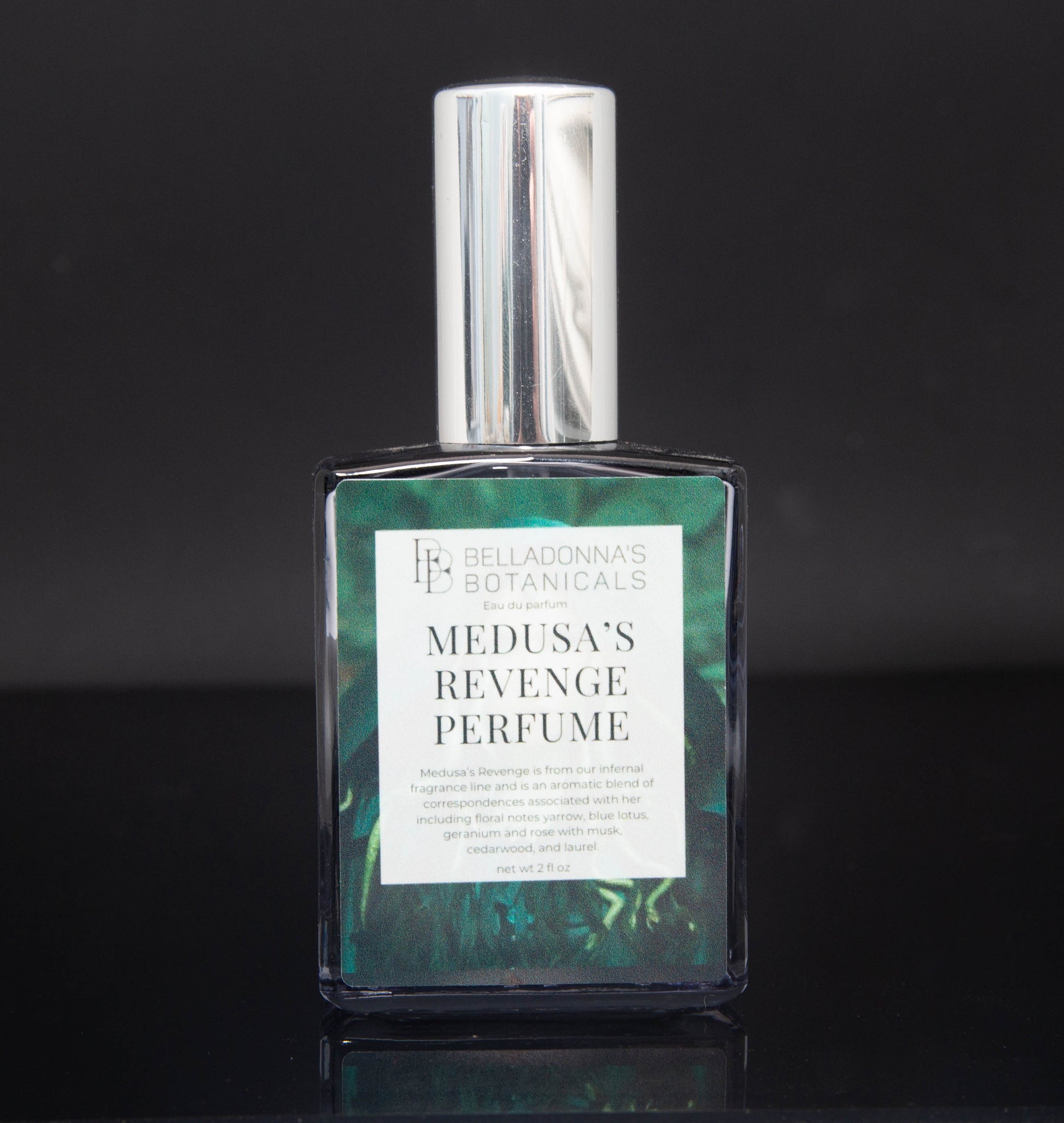Medusa’s Revenge is from our infernal fragrance line and is an aromatic blend of correspondences associated with her including floral notes yarrow, blue lotus, geranium and rose with musk, cedarwood, and laurel.