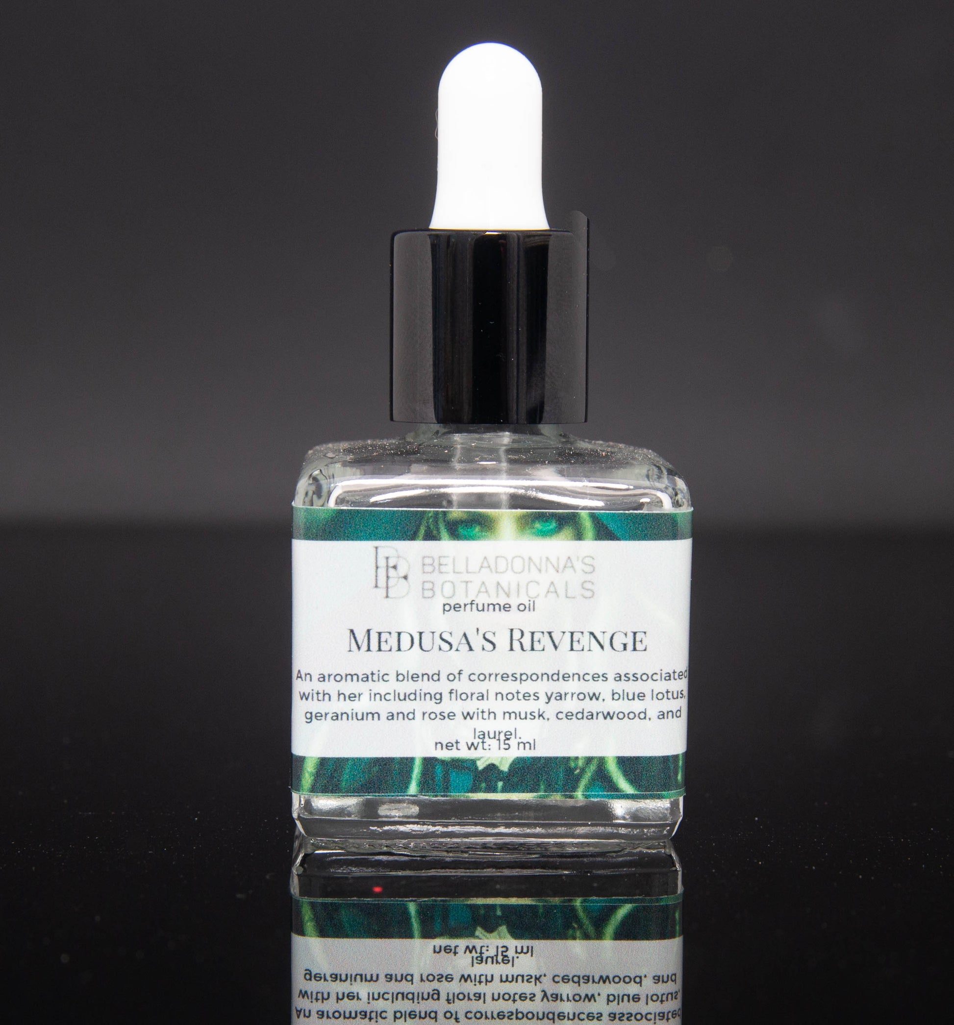 Medusa’s Revenge is from our infernal fragrance line and is an aromatic blend of correspondences associated with her including floral notes yarrow, blue lotus, geranium and rose with musk, cedarwood, and laurel.