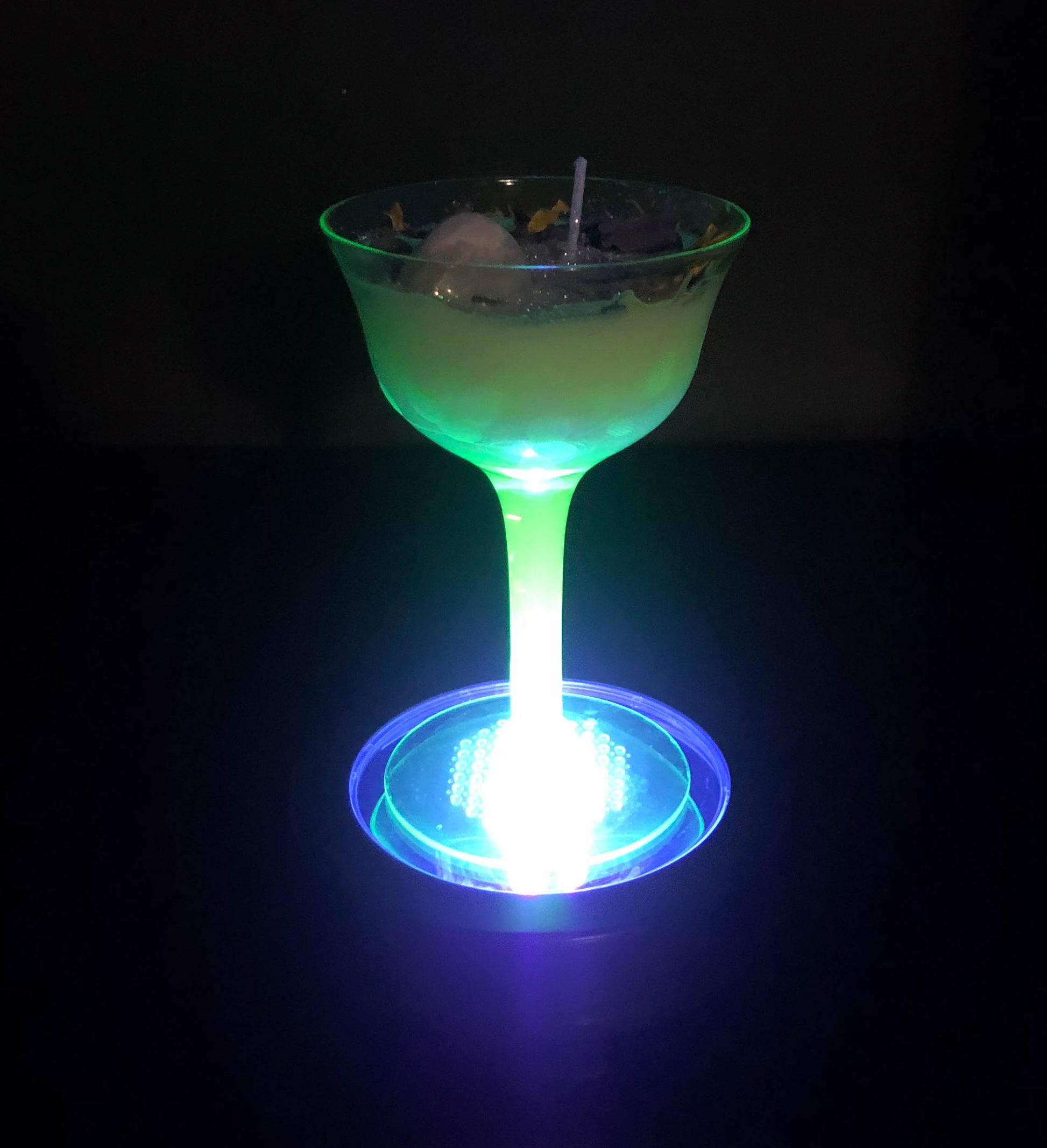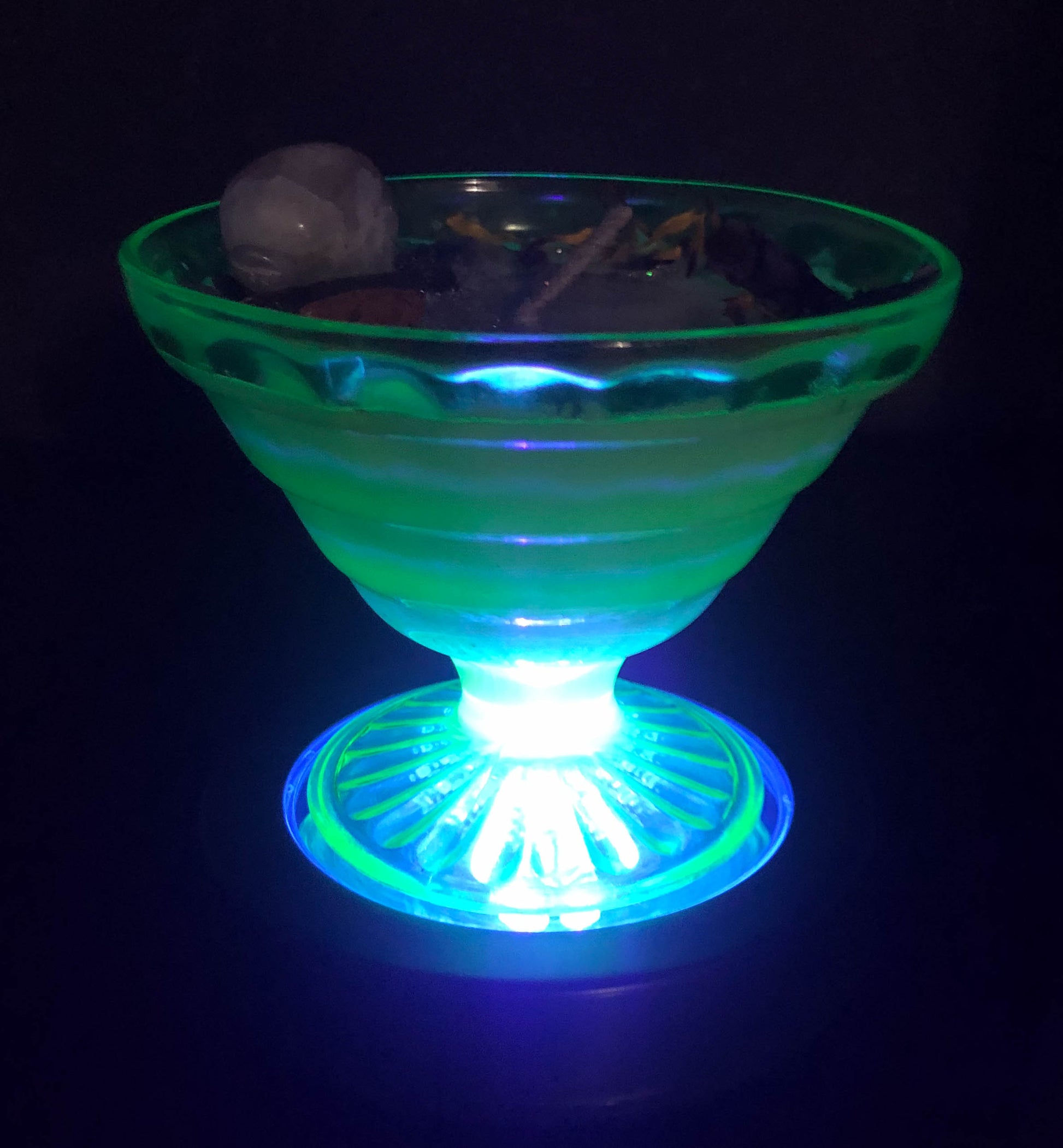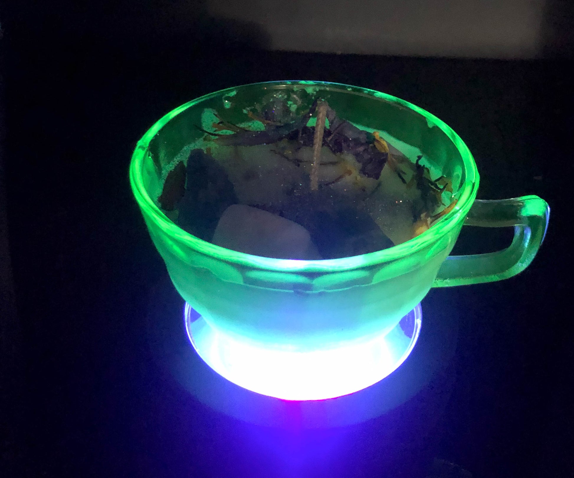Container: Paraffin Wax and Candle Dye in Uranium glass with LED light up coaster (batteries included)